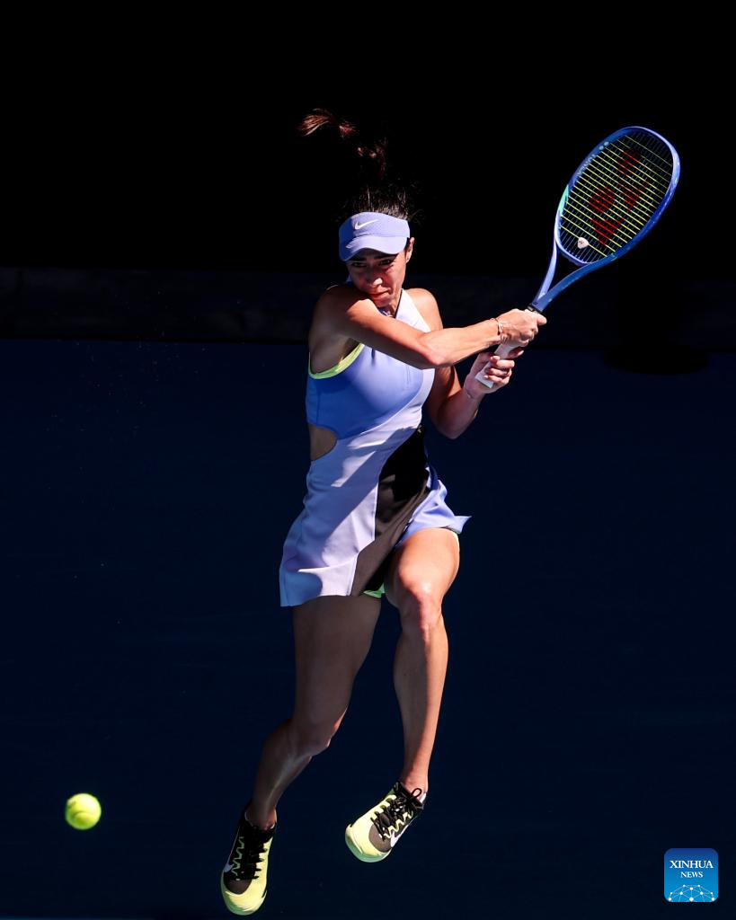 Olga Danilovic of Serbia hits a return during the women's singles 2nd round match against Coco Gauff of the United States at the Australian Open tennis tournament in Melbourne, Australia, Jan. 21, 2026. (Xinhua/Ma Ping)