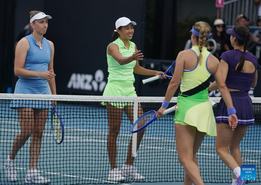 Zhang Shuai (2nd L)/Elise Mertens (1st L) greets with their opponents after the women's doubles 1st round match between Zhang Shuai (China)/Elise Mertens (Belgium) and Sorana Cirstea (Romania)/Anna Kalinskaya (Russia) at the Australian Open tennis tournament in Melbourne, Australia, Jan. 21, 2026. (Photo by Wang Shen/Xinhua)