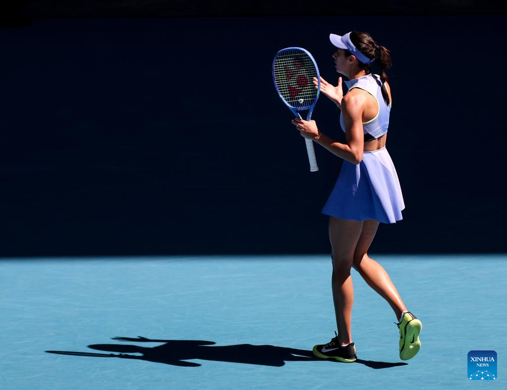 Olga Danilovic of Serbia reacts during the women's singles 2nd round match against Coco Gauff of the United States at the Australian Open tennis tournament in Melbourne, Australia, Jan. 21, 2026. (Xinhua/Ma Ping)