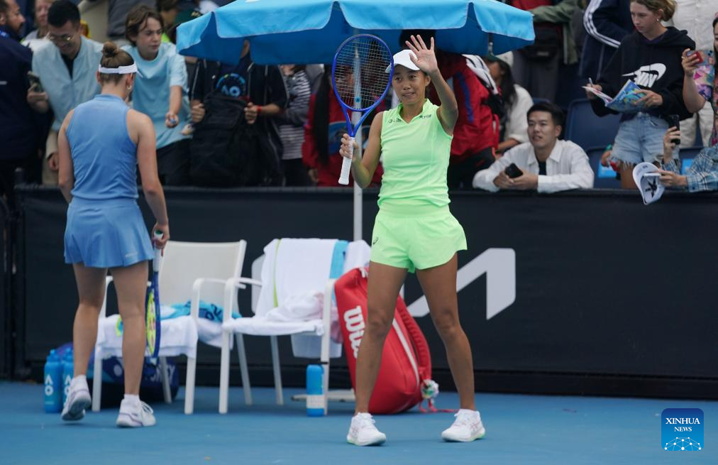 Zhang Shuai (R) waves to the spectators after the women's doubles 1st round match between Zhang Shuai (China)/Elise Mertens (Belgium) and Sorana Cirstea (Romania)/Anna Kalinskaya (Russia) at the Australian Open tennis tournament in Melbourne, Australia, Jan. 21, 2026. (Photo by Wang Shen/Xinhua)