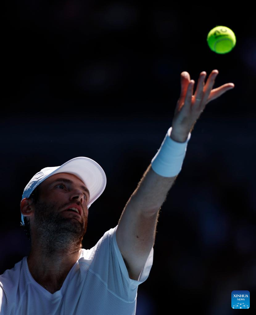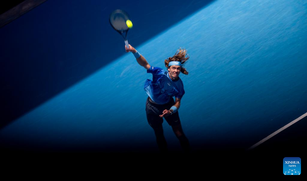 Andrey Rublev of Russia serves during the men's singles 2nd round match against Jaime Faria of Portugal at the Australian Open tennis tournament in Melbourne, Australia, Jan. 21, 2026 (Photo by Hu Jingchen/Xinhua)
