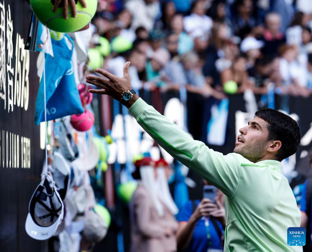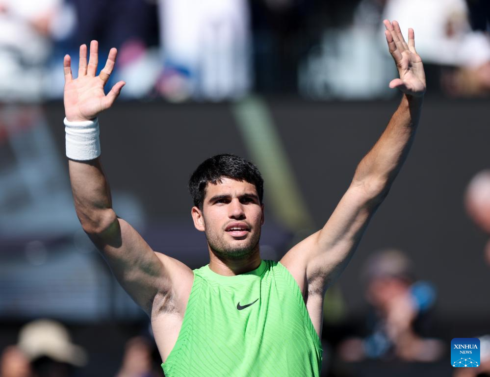 Carlos Alcaraz of Spain reacts with fans after the men's singles 2nd round match against Yannick Hanfmann of Germany at the Australian Open tennis tournament in Melbourne, Australia, Jan. 21, 2026. (Xinhua/Ma Ping)