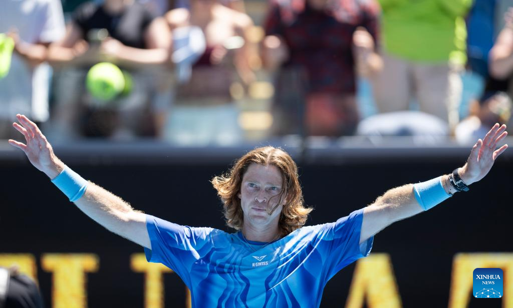 Andrey Rublev of Russia celebrates after winning the men's singles 2nd round match against Jaime Faria of Portugal at the Australian Open tennis tournament in Melbourne, Australia, Jan. 21, 2026 (Photo by Hu Jingchen/Xinhua)