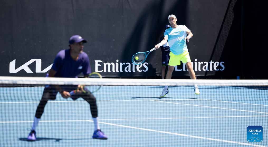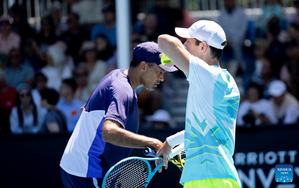 Rajeev Ram of the United States/Matthew Ebden (R) of Australia compete during the men's doubles 1st round match against Zhang Zhizhen/Shang Juncheng of China at the Australian Open tennis tournament in Melbourne, Australia, Jan. 21, 2026. (Photo by Hu Jingchen/Xinhua)