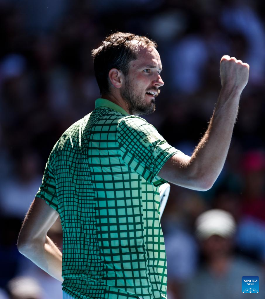 Daniil Medvedev of Russia celebrates scoring during the men's singles 2nd round match between Daniil Medvedev of Russia and Quentin Halys of France at the Australian Open tennis tournament in Melbourne, Australia, Jan. 21, 2026. (Xinhua/Ma Ping)