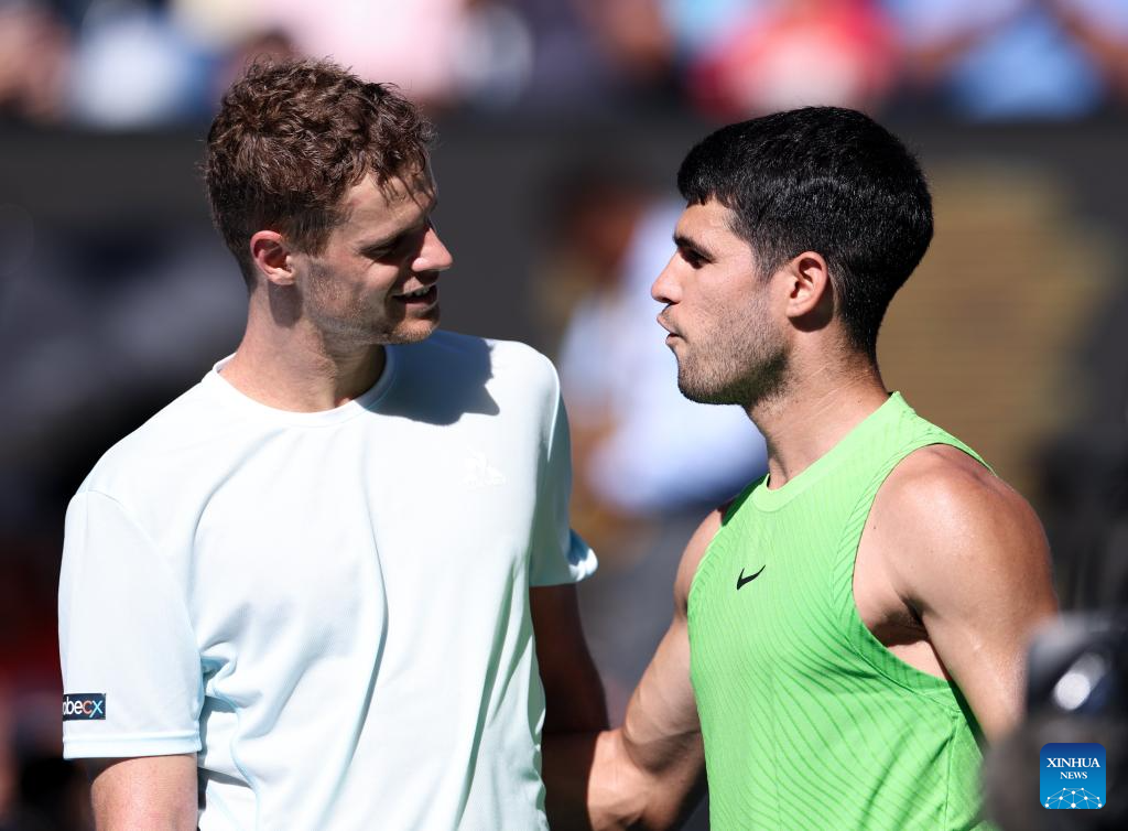 Carlos Alcaraz (R) of Spain and Yannick Hanfmann of Germany react after the men's singles 2nd round match between Carlos Alcaraz of Spain and Yannick Hanfmann of Germany at the Australian Open tennis tournament in Melbourne, Australia, Jan. 21, 2026. (Xinhua/Ma Ping)