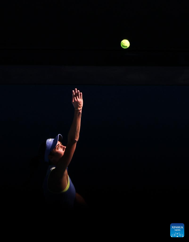 Olga Danilovic of Serbia serves during the women's singles 2nd round match against Coco Gauff of the United States at the Australian Open tennis tournament in Melbourne, Australia, Jan. 21, 2026. (Xinhua/Ma Ping)