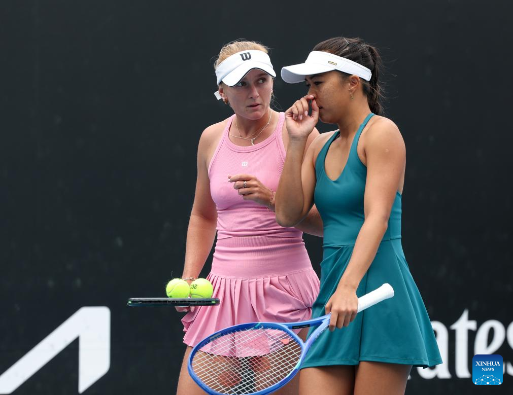 Taylah Preston(L)/Lizette Cabrera of Australia talk during the women's doubles 1st round match against Wang Xinyu/Zheng Saisai of China at the Australian Open tennis tournament in Melbourne, Australia, Jan. 21, 2026. (Xinhua/Ma Ping)