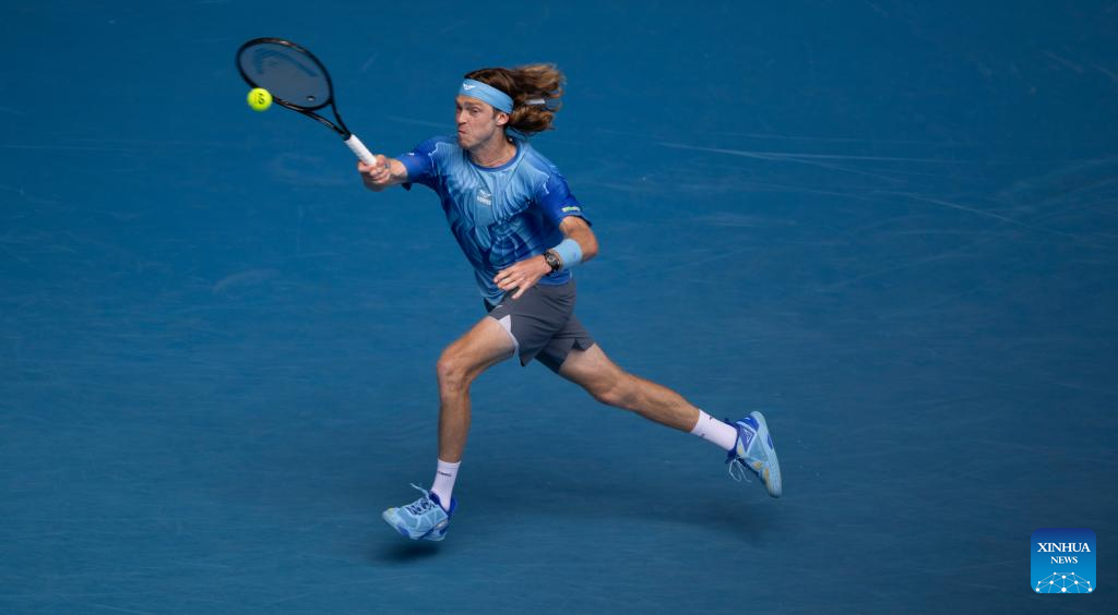 Andrey Rublev of Russia hits a return during the men's singles 2nd round match against Jaime Faria of Portugal at the Australian Open tennis tournament in Melbourne, Australia, Jan. 21, 2026 (Photo by Hu Jingchen/Xinhua)
