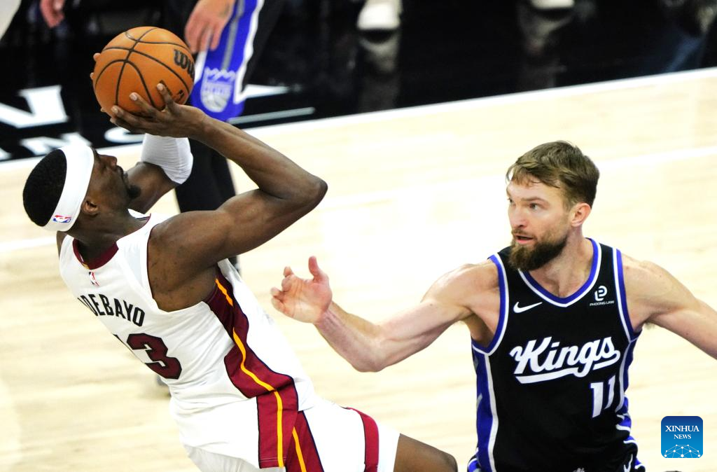 Sacramento Kings' Domantas Sabonis (R) defends Miami Heats' Bam Adebayo during the 2025-2026 NBA regular season basketball game between Miami Heats and Sacramento Kings in Sacramento, the United States, Jan. 20, 2026. (Xinhua/Wu Xiaoling)