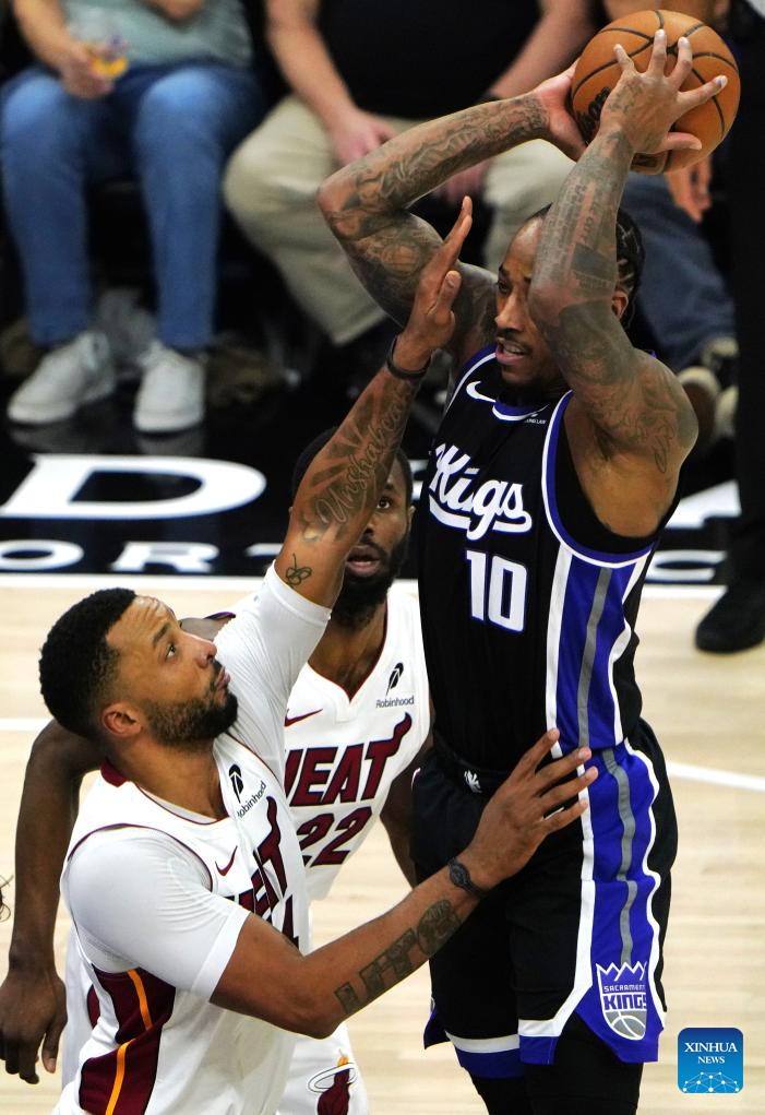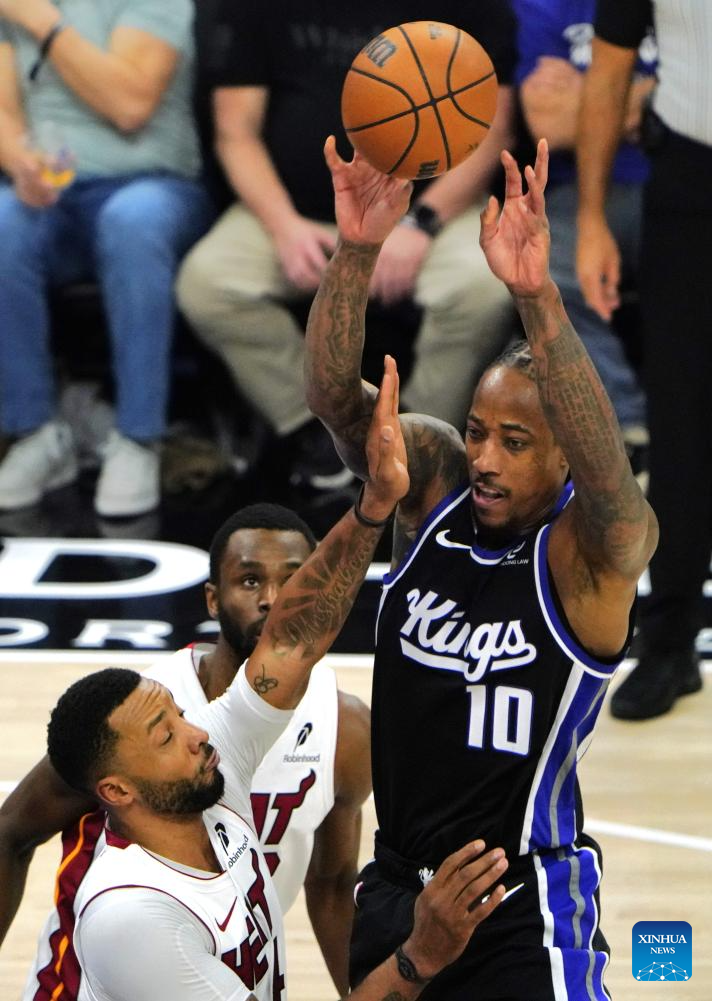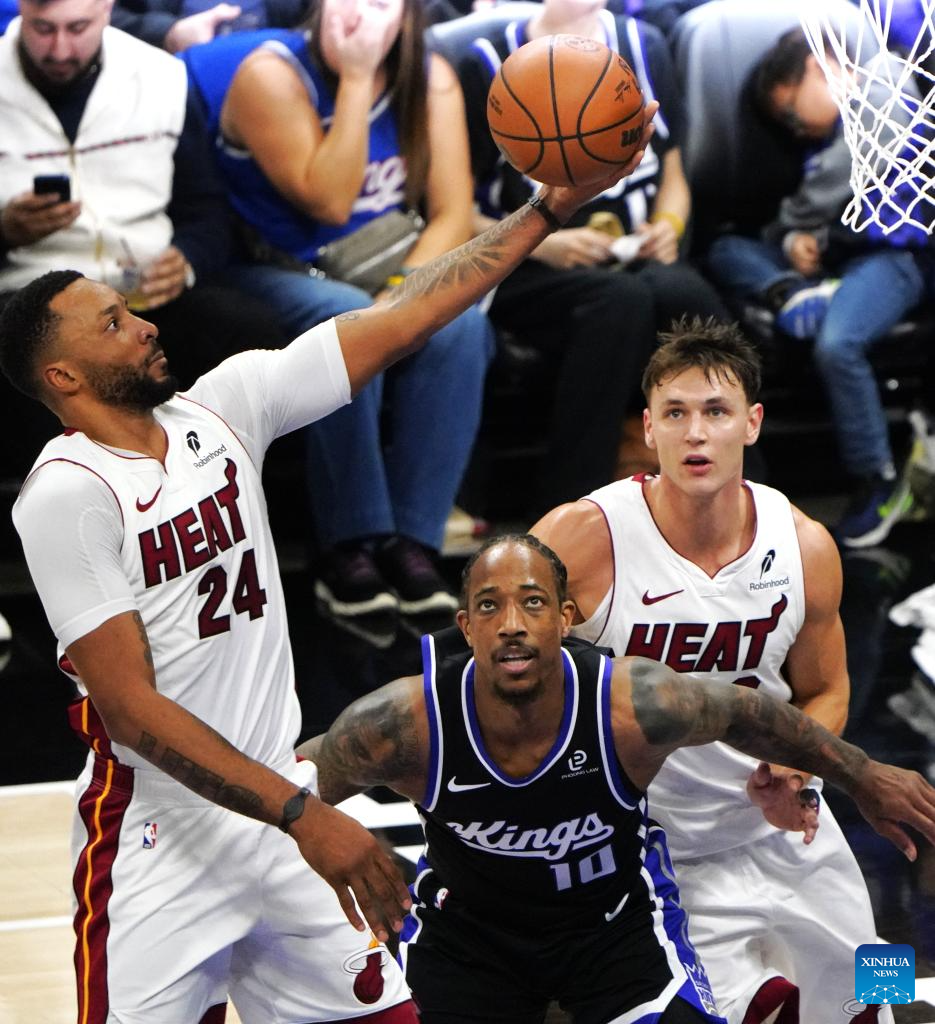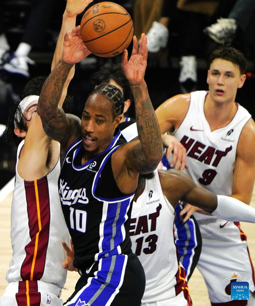 Sacramento Kings' DeMar DeRozan (R) competes during the 2025-2026 NBA regular season basketball game between Miami Heats and Sacramento Kings in Sacramento, the United States, Jan. 20, 2026. (Xinhua/Wu Xiaoling)