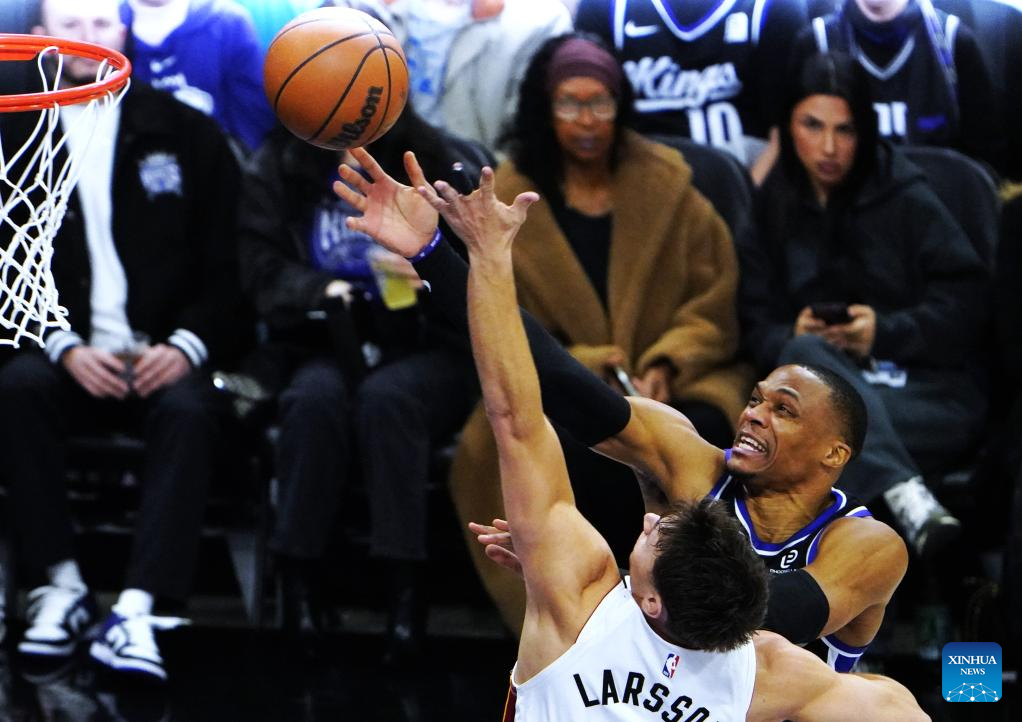 Sacramento Kings' Russell Westbrook (top) goes for a layup during the 2025-2026 NBA regular season basketball game between Miami Heats and Sacramento Kings in Sacramento, the United States, Jan. 20, 2026. (Xinhua/Wu Xiaoling)