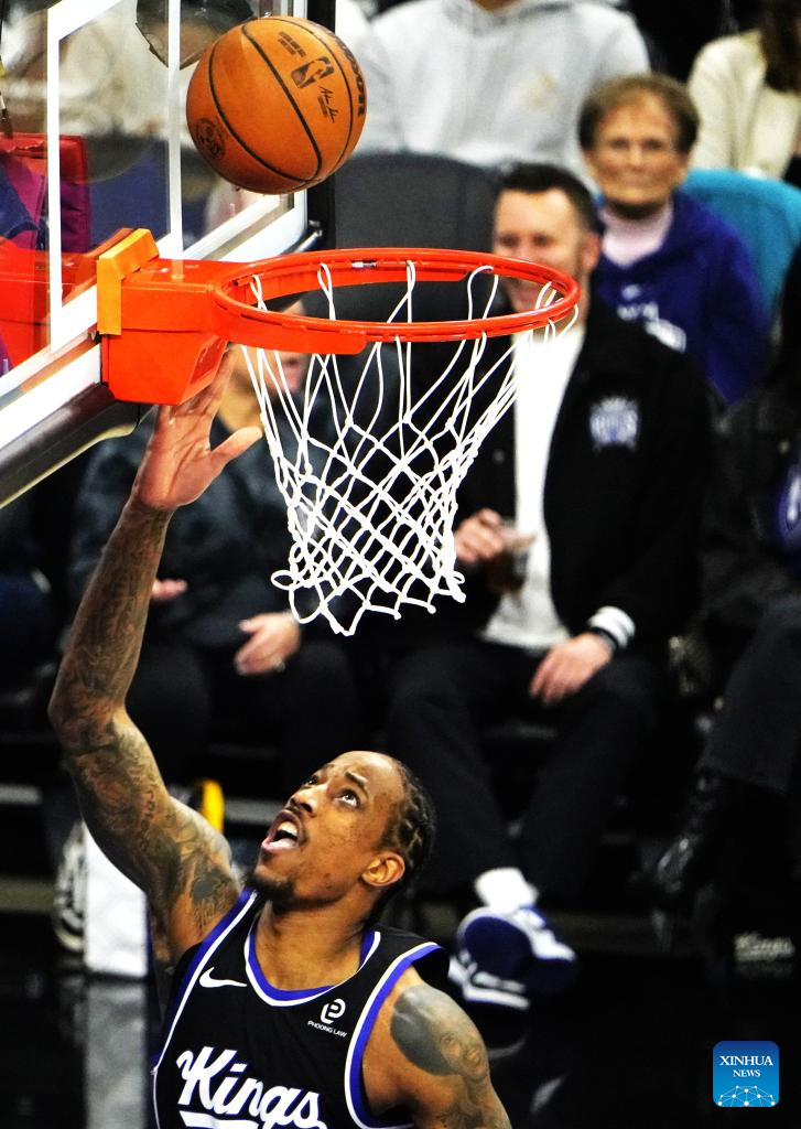 Sacramento Kings' DeMar DeRozan (L) goes for a layup during the 2025-2026 NBA regular season basketball game between Miami Heats and Sacramento Kings in Sacramento, the United States, Jan. 20, 2026. (Xinhua/Wu Xiaoling)