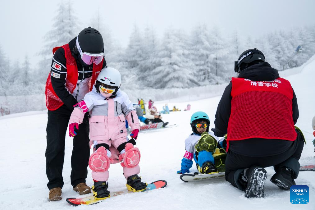 Children learn to ski at a ski resort in Shennongjia Forestry District, central China's Hubei Province, Jan. 20, 2026. In recent years, Hubei Province has leveraged its strategic location as a transportation hub connecting nine provinces, tapping into its unique ice and snow resources to vigorously develop the ice and snow tourism industry. Multiple locations in Hubei have become well-known ice and snow tourism destinations, attracting numerous tourists to experience the joys of winter sports. (Xinhua/Wu Zhizun)