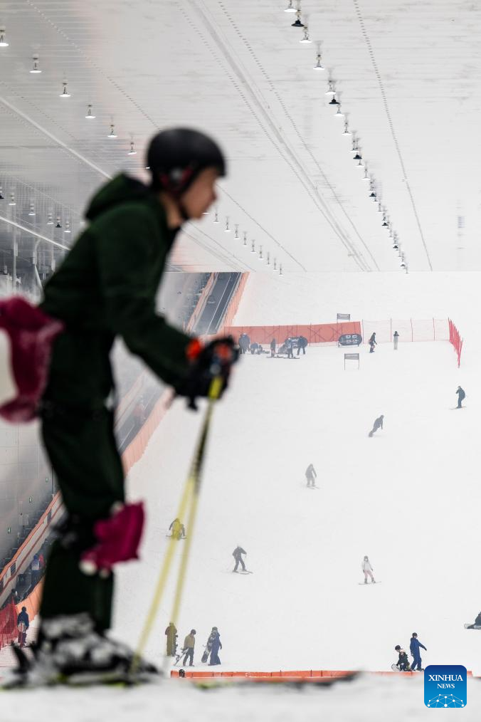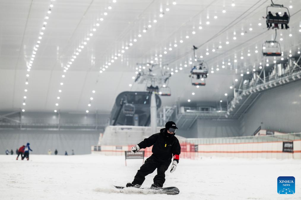 A tourist skies at a ski resort located within a shopping mall in Shennongjia Forestry District, central China's Hubei Province, Jan. 13, 2026. In recent years, Hubei Province has leveraged its strategic location as a transportation hub connecting nine provinces, tapping into its unique ice and snow resources to vigorously develop the ice and snow tourism industry. Multiple locations in Hubei have become well-known ice and snow tourism destinations, attracting numerous tourists to experience the joys of winter sports. (Xinhua/Wu Zhizun)