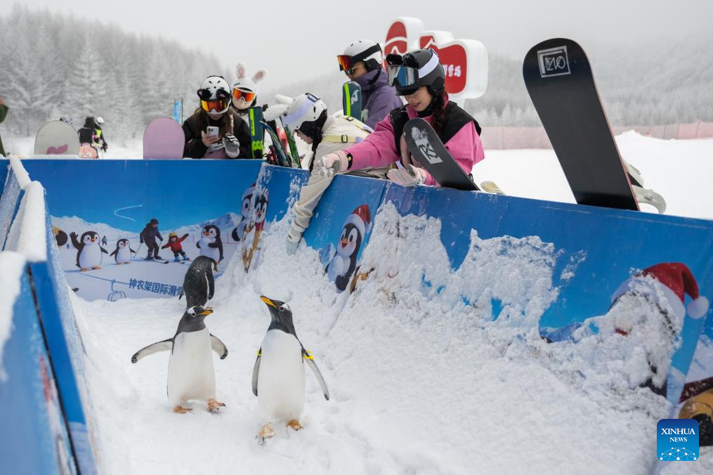 Tourists watch penguins at a ski resort in Shennongjia Forestry District, central China's Hubei Province, Jan. 20, 2026. In recent years, Hubei Province has leveraged its strategic location as a transportation hub connecting nine provinces, tapping into its unique ice and snow resources to vigorously develop the ice and snow tourism industry. Multiple locations in Hubei have become well-known ice and snow tourism destinations, attracting numerous tourists to experience the joys of winter sports. (Xinhua/Du Zixuan)