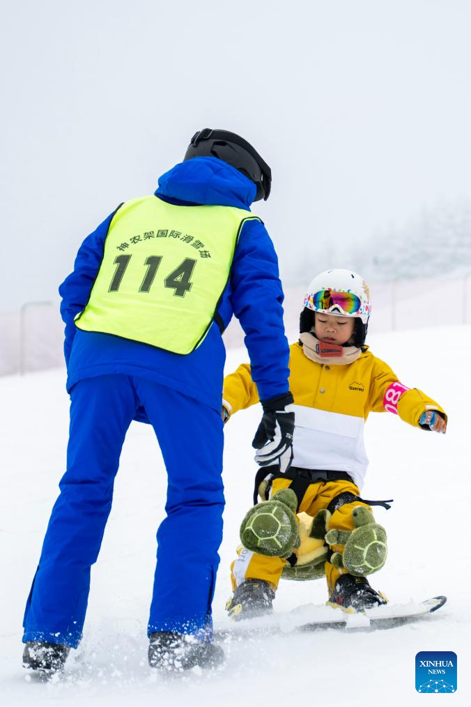 A child learns to ski at a ski resort in Shennongjia Forestry District, central China's Hubei Province, Jan. 20, 2026. In recent years, Hubei Province has leveraged its strategic location as a transportation hub connecting nine provinces, tapping into its unique ice and snow resources to vigorously develop the ice and snow tourism industry. Multiple locations in Hubei have become well-known ice and snow tourism destinations, attracting numerous tourists to experience the joys of winter sports. (Xinhua/Wu Zhizun)