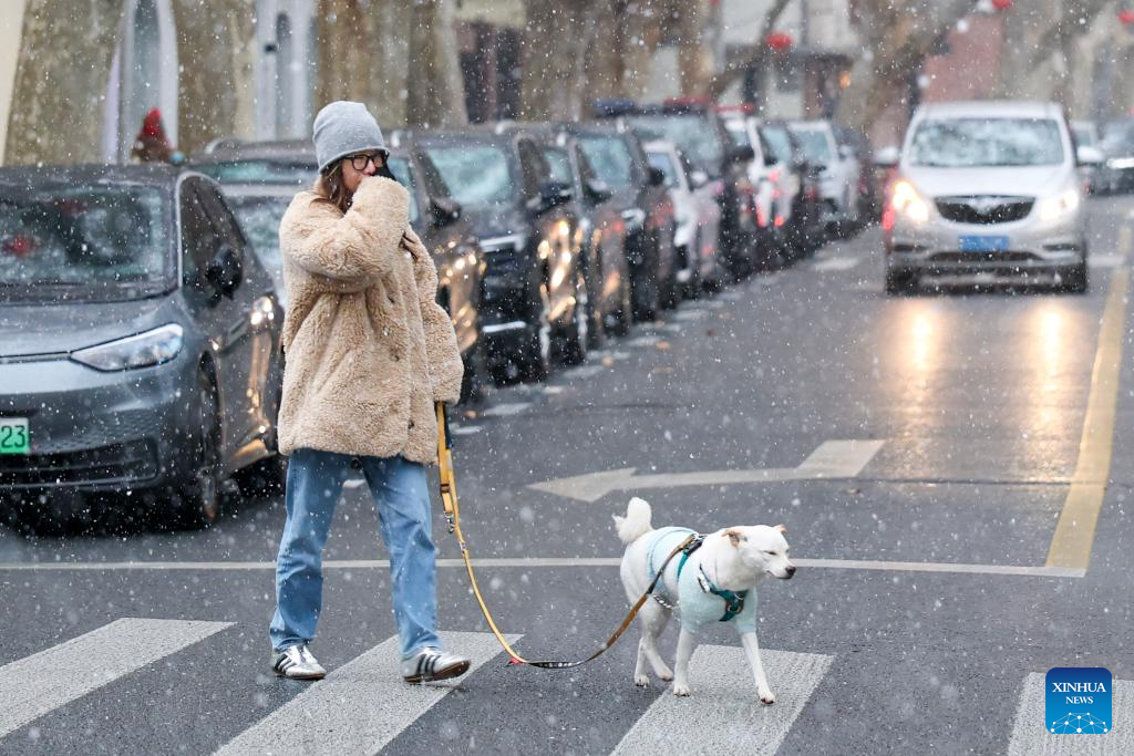 A woman walks her dog amid snow in Xuhui District of Shanghai, east China, Jan. 20, 2026. Regarding widespread snowfall and temperature drops in various regions across China, measures have been taken to actively respond to these weather conditions. (Xinhua/Wang Xiang)