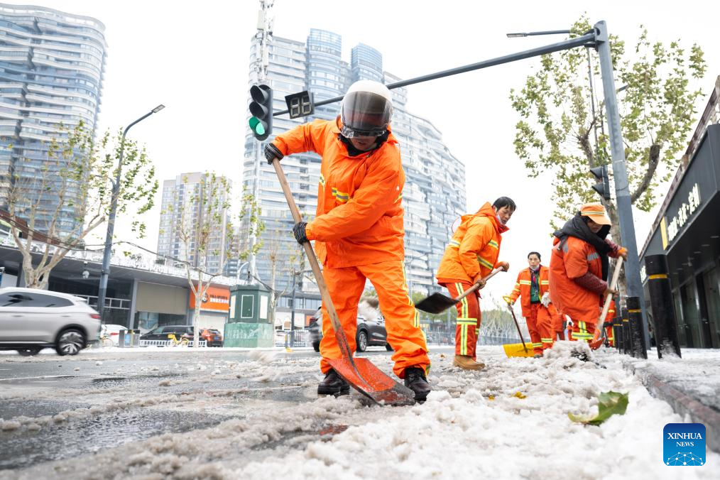 People clear snow on a road in Nanjing, east China's Jiangsu Province, Jan. 20, 2026. Regarding widespread snowfall and temperature drops in various regions across China, measures have been taken to actively respond to these weather conditions. (Photo by Liu Zhenrui/Xinhua)