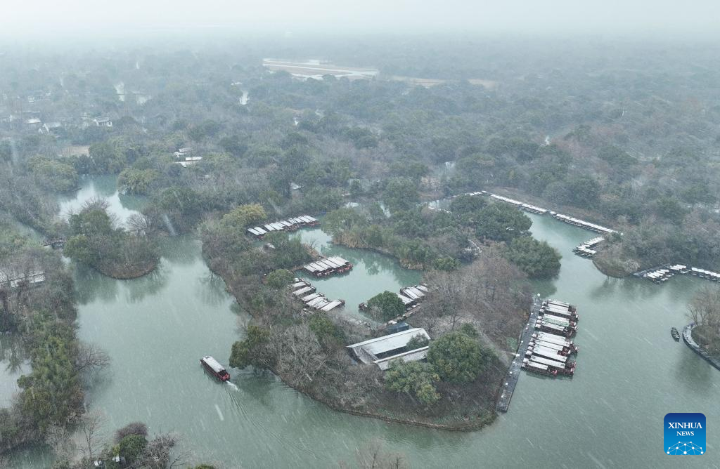 An aerial drone photo taken on Jan. 20, 2026 shows a sightseeing boat traveling amid snow at the Xixi National Wetland Park in Hangzhou, east China's Zhejiang Province. Regarding widespread snowfall and temperature drops in various regions across China, measures have been taken to actively respond to these weather conditions. (Xinhua/Weng Xinyang)