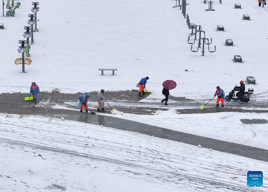 A drone photo taken on Jan. 20, 2026 shows staff members clearing snow in Hefei, east China's Anhui Province. Regarding widespread snowfall and temperature drops in various regions across China, measures have been taken to actively respond to these weather conditions. (Xinhua/Du Yu)