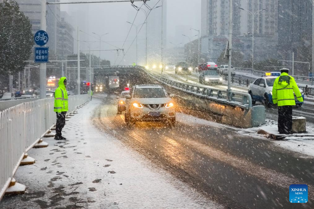 Police officers direct traffic near the Jianghan Bridge in Wuhan, central China's Hubei Province, Jan. 20, 2026. Regarding widespread snowfall and temperature drops in various regions across China, measures have been taken to actively respond to these weather conditions. (Xinhua/Xiao Yijiu)