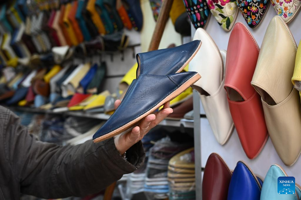A resident shops for traditional Moroccan shoes at a local market in Rabat, Morocco, on March 19, 2026. (Photo by Aissa/Xinhua)