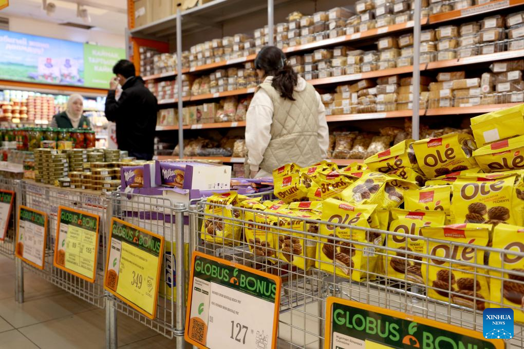People select goods in a supermarket in Bishkek, Kyrgyzstan, Jan. 15, 2026. Kyrgyzstan's gross domestic product (GDP) surged 11.1 percent last year to reach 22.6 billion U.S. dollars, according to official data released on Monday. (Photo by Roman/Xinhua)