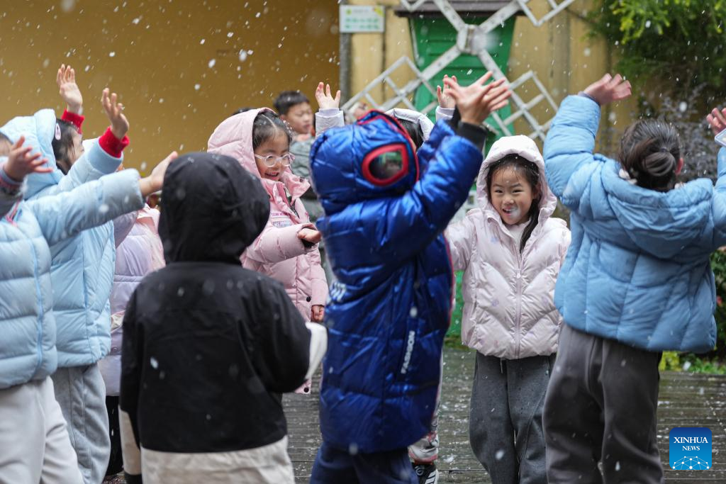 Children have fun amid snow at a kindergarten in Hangzhou, east China's Zhejiang Province, Jan. 20, 2026. Regarding widespread snowfall and temperature drops in various regions across China, measures have been taken to actively respond to these weather conditions. (Xinhua/Huang Zongzhi)