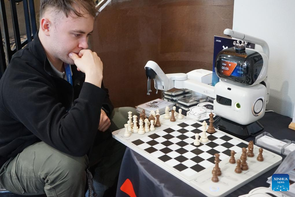 A man plays chess with an AI-powered chess robot at the exhibition area of Chinese company SenseRobot at a pre-show event of the 2026 Consumer Electronics Show (CES) in Las Vegas, the United States, Jan. 5, 2026. (Photo by Zeng Hui/Xinhua)