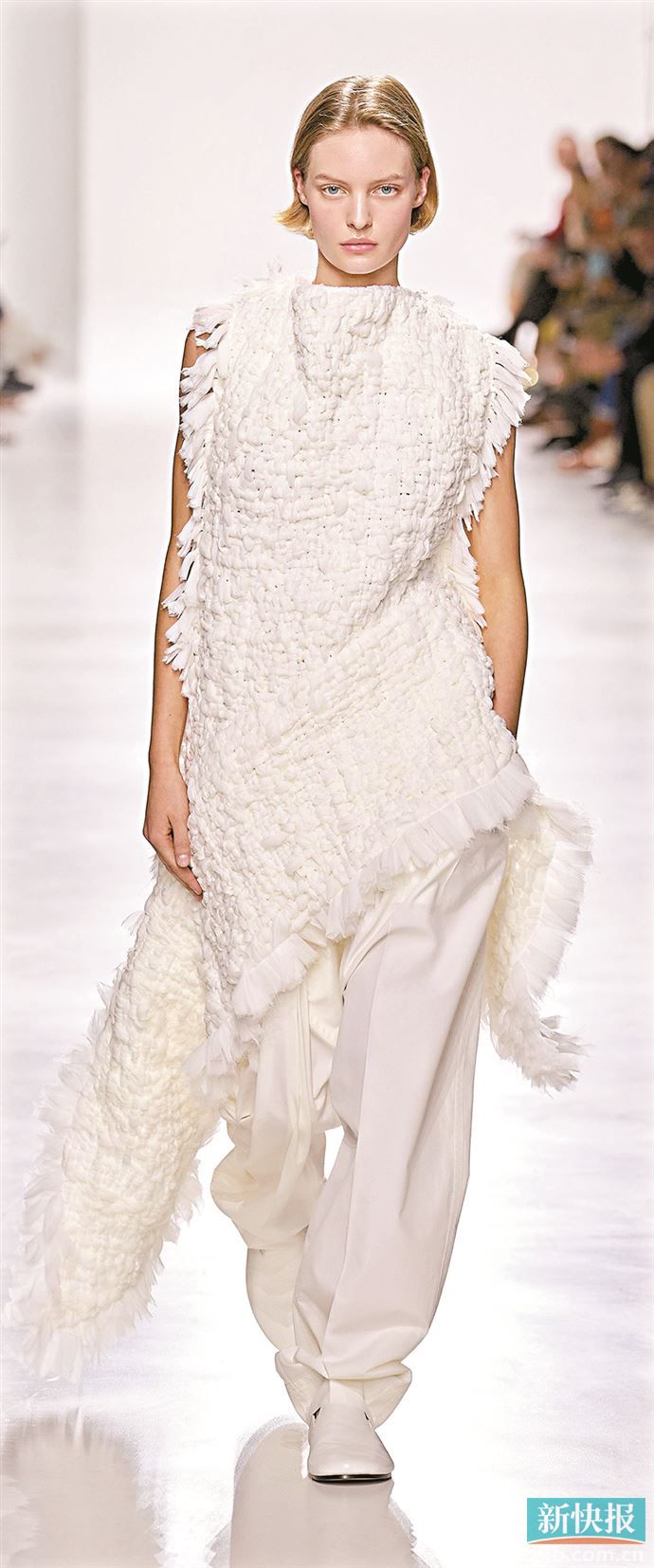 潘通将其定义为“高贵且轻盈的白”,落到时装设计上,高贵气质并非靠“白得发光”来凸显,而是更多依靠材质层次来演绎,如薄纱、缎面、皮革、针织、蕾丝等,都是能放大这一色彩贵气质感的材质。同时“云上舞白”作为底色,在褶皱、纹理、堆叠等手法加持下营造出灵动层次感,行走时更恰如其名般好似“舞动”起来,将这一色彩的动态美学动人呈现。