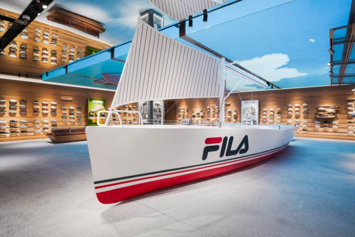 区域中心特别陈列了一艘复刻“FILA TRI号”的帆船装置 —— 1999年,FILA 赞助意大利帆船家吉奥瓦尼·索尔迪尼(Giovanni Soldini)驾驶该帆船原型,独自航行大西洋116天,创下了新的世界纪录。“荣耀回廊”则集中展示了品牌在航海、滑雪、登山、网球、高尔夫等领域的“冠军时刻”,以及陪伴冠军的单品。