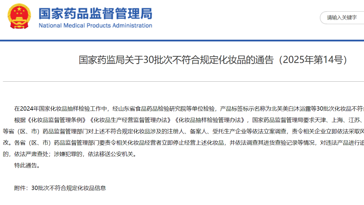 國家藥監(jiān)局關(guān)于30批次不符合規(guī)定化妝品的通告(2025年第14號(hào))