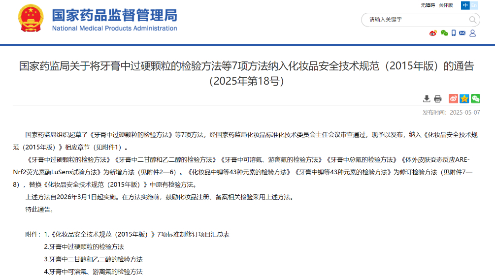國家藥監(jiān)局關(guān)于將牙膏中過硬顆粒的檢驗(yàn)方法等7項(xiàng)方法納入化妝品安全技術(shù)規(guī)范(2015年版)的通告(2025年第18號(hào))