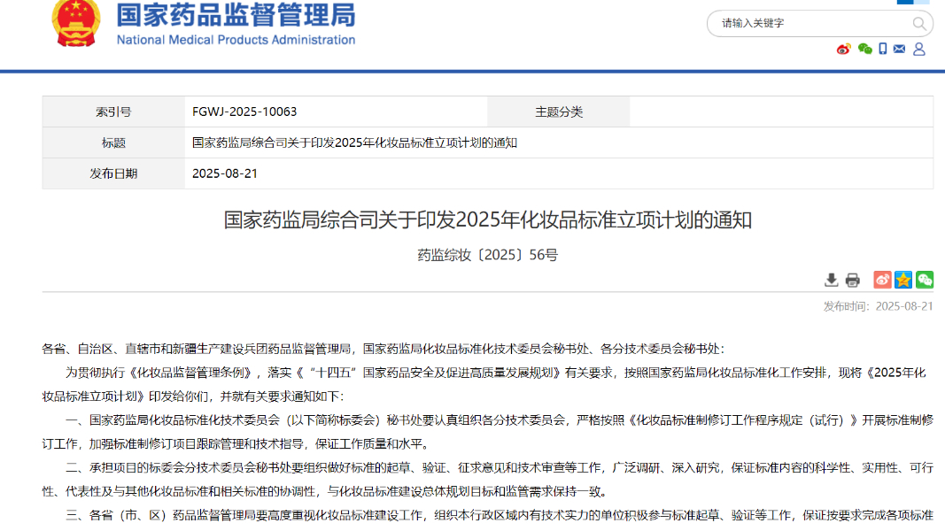 國家藥監(jiān)局綜合司關(guān)于印發(fā)2025年化妝品標(biāo)準(zhǔn)立項(xiàng)計(jì)劃的通知