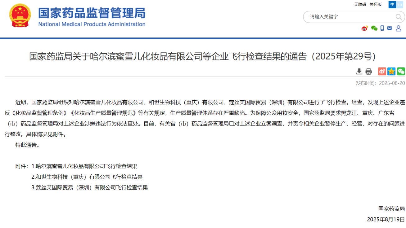 國家藥監(jiān)局關(guān)于哈爾濱蜜雪兒化妝品有限公司等企業(yè)飛行檢查結(jié)果的通告(2025年第29號(hào))