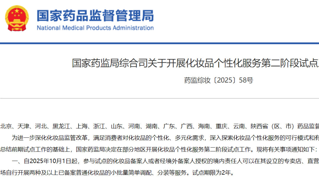 國家藥監(jiān)局綜合司關(guān)于開展化妝品個(gè)性化服務(wù)第二階段試點(diǎn)工作的通知 藥監(jiān)綜妝〔2025〕58號(hào)