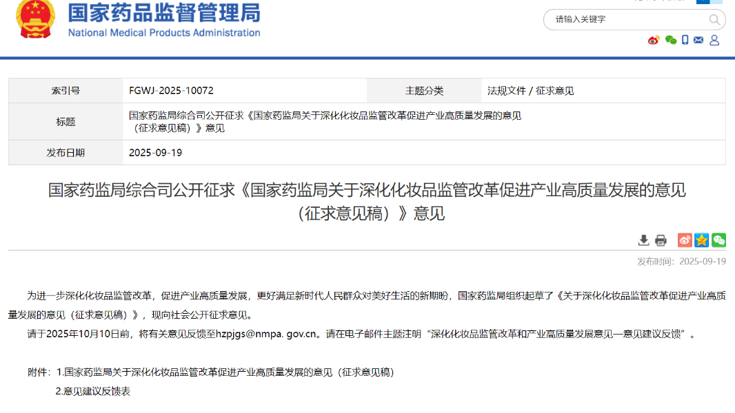 國家藥監(jiān)局關(guān)于深化化妝品監(jiān)管改革促進(jìn)產(chǎn)業(yè)高質(zhì)量發(fā)展的意見 國藥監(jiān)妝〔2025〕18號(hào)