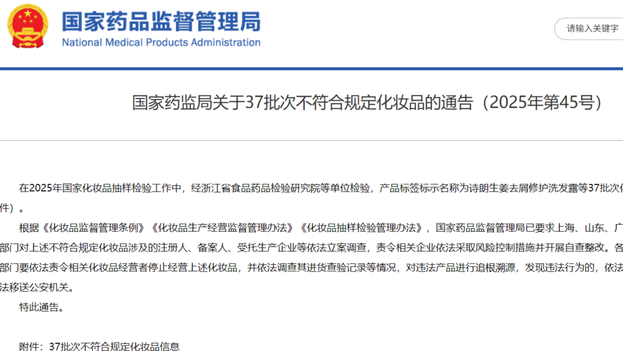 國家藥監(jiān)局關(guān)于37批次不符合規(guī)定化妝品的通告(2025年第45號(hào))