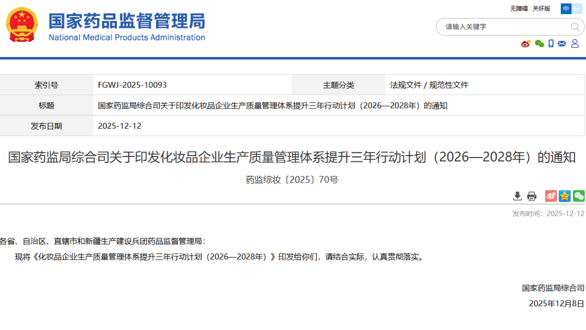 國家藥監(jiān)局綜合司關(guān)于印發(fā)化妝品企業(yè)生產(chǎn)質(zhì)量管理體系提升三年行動(dòng)計(jì)劃(2026—2028年)的通知 藥監(jiān)綜妝〔2025〕70號(hào)