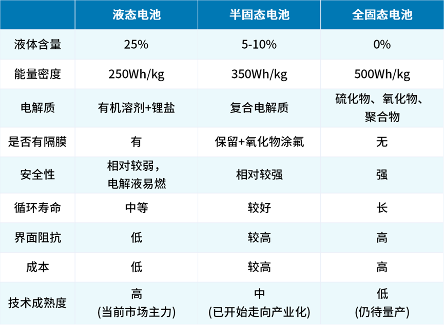 表:液态电池、半固态电池、全固态电池对比