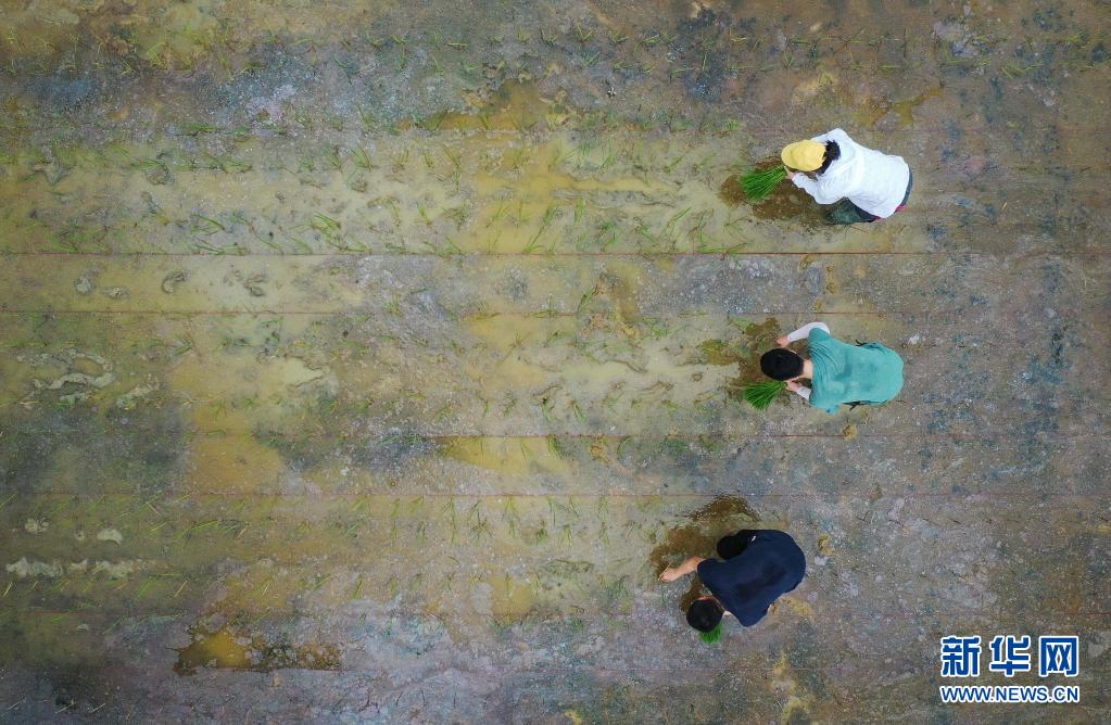 研究人員在廣州增城華南農(nóng)業(yè)大學(xué)試驗(yàn)田插種嫦娥五號(hào)搭載的太空稻秧苗(2021年3月29日攝,無人機(jī)照片)。共計(jì)40克的“天稻”于2020年11月搭乘嫦娥五號(hào)登月,歷時(shí)約23天、76萬(wàn)公里的“環(huán)月旅行”返回地球。