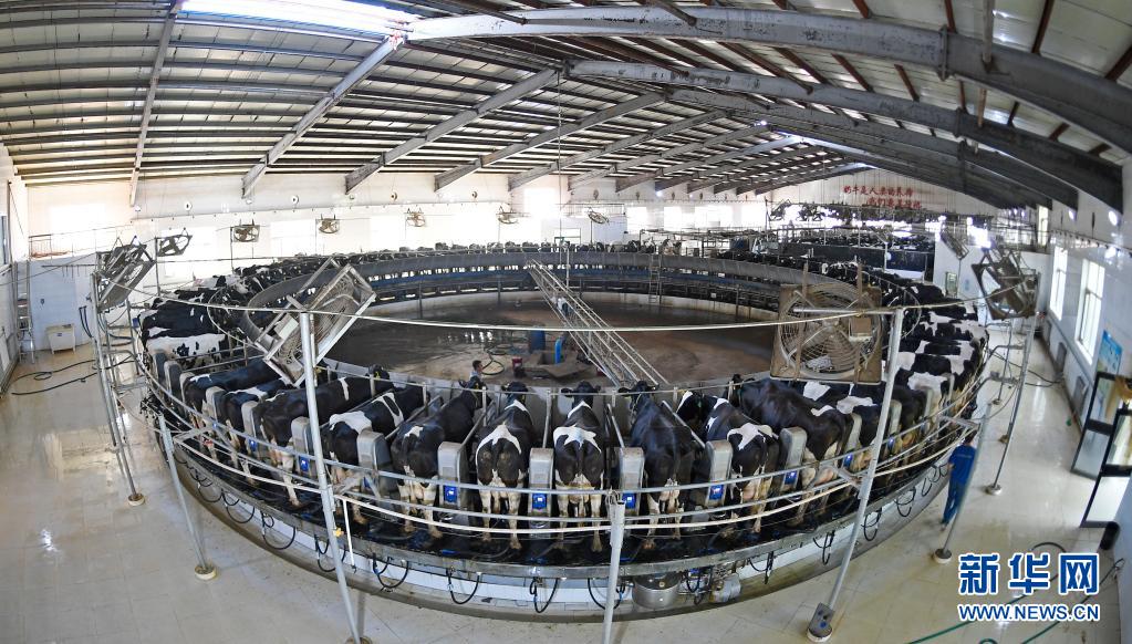 寧夏中衛(wèi)市沐沙牧場的工作人員為自動轉盤式奶臺上的奶牛擠奶(2020年9月14日攝)。寧夏中衛(wèi)市沐沙牧場,經(jīng)過7年時間,改造沙漠近萬畝。昔日數(shù)十米高的流動沙丘經(jīng)過治理改造,變身飼草玉米種植基地,荒蕪的沙地變身“奶牛樂園”。