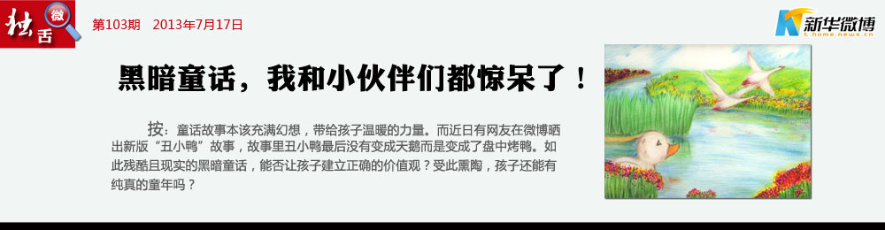 【黑暗童話也有正能量】 兒童閱讀黑暗童話——丑小鴨變烤鴨并不可怕,這是一種挫折教育。孩子的成長需要適度的挫折教育。一直活在象牙塔里的孩子,在走入社會之后很難適應現(xiàn)實的生活,他們常常因為學業(yè)或工作中的一點挫折而走向極端。因此,在其進入社會之前進行適度的挫折教育必不可少。