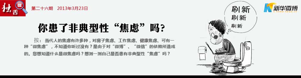 親,你出現(xiàn)“微焦慮”癥狀了嗎? 不“織圍脖”、不接發(fā)微信就寢食難安,出現(xiàn)焦慮、依賴、強(qiáng)迫等心理問題。這就是患上了微博焦慮癥,簡(jiǎn)稱為“微焦慮”。