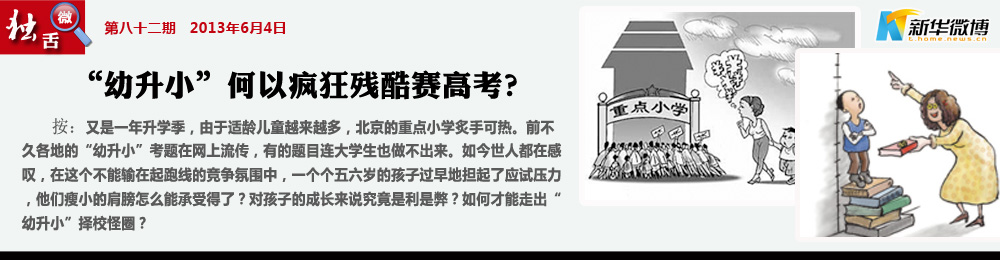 【孩子精神分裂】 A校搞面談,B??紛W數(shù),C??粗夭潘嚕珼校要英語會話,孩子們考前往往要精神分裂好長一段時間,學(xué)生進一次校門就得背一次考試圣經(jīng)。