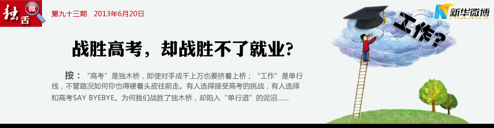 花費(fèi)了高昂的學(xué)習(xí)成本、浪費(fèi)了寶貴的年華、經(jīng)歷了非人的摧殘,結(jié)果戰(zhàn)勝了高考,卻陷入“就業(yè)難”的泥沼。當(dāng)很多大學(xué)生面臨畢業(yè)就失業(yè)、起薪比農(nóng)民工還低的時(shí)候,曾一直縈繞在耳邊的“高考成功、人生美滿(mǎn)”的話(huà)語(yǔ),怎么變成了一記耳光、一個(gè)笑話(huà)?