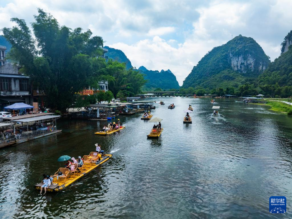 游客在广西百色靖西市鹅泉景区乘坐竹筏游览。
