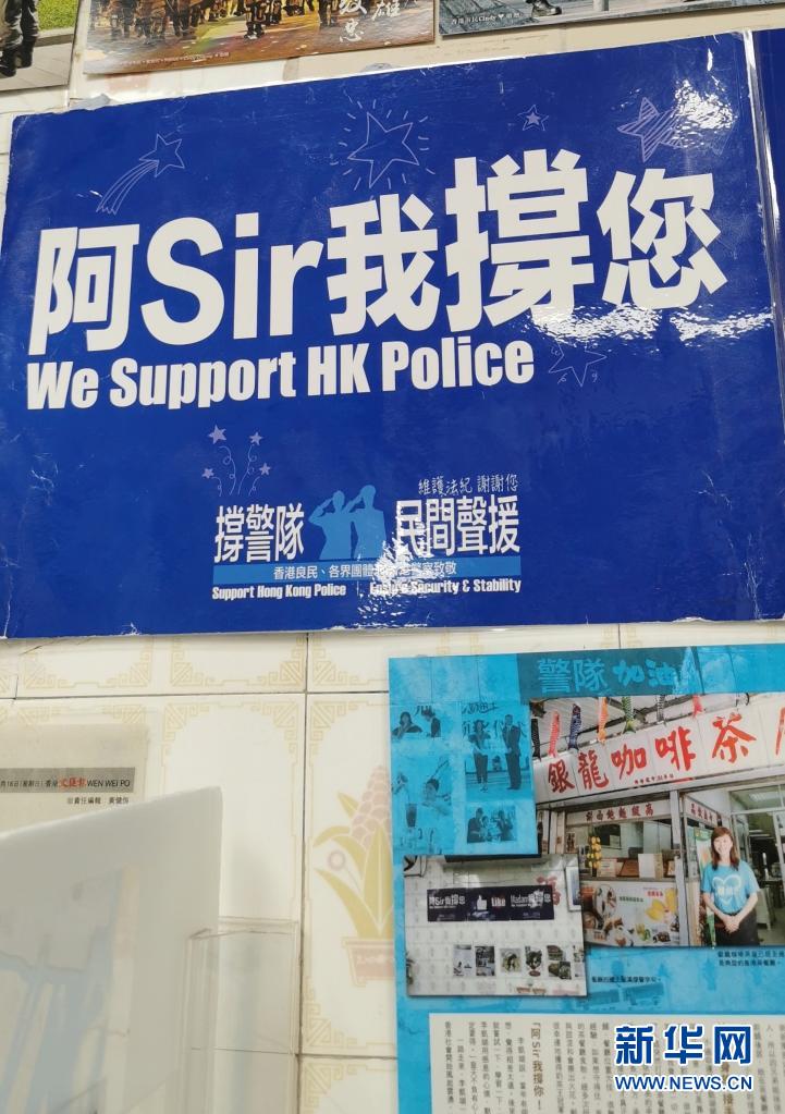 香港鯉魚門“銀龍咖啡茶座”餐廳內(nèi)張貼著許多撐警的海報(bào),這張海報(bào)是2019年6月30日李凱瑚從萬人撐警大會(huì)上領(lǐng)回的(7月26日攝)。 新華社記者 陸敏 攝