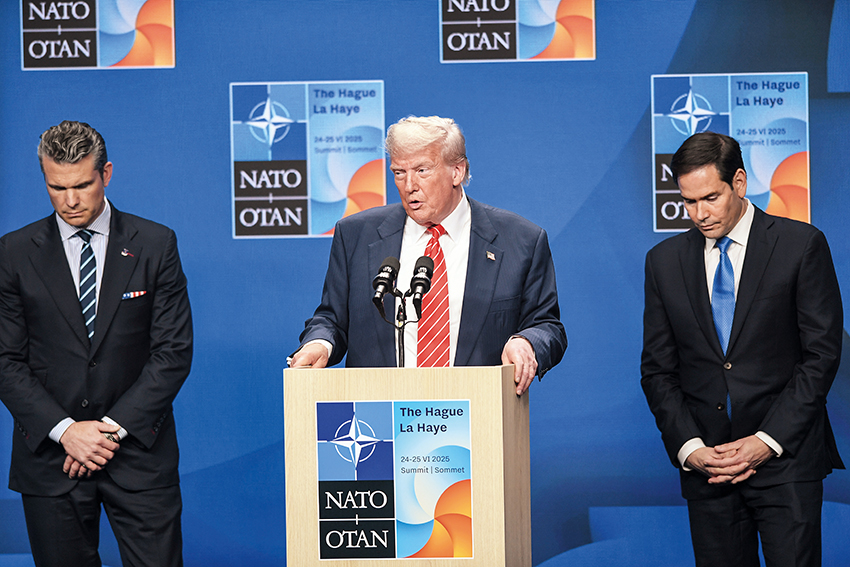 6 月 25 日,美国总统特朗普(中)在荷兰海牙出席记者会